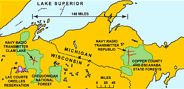 The Navy’s ELF transmitter sites. At the Clam Lake facility there were two 14-mi. in-ground dipoles. At the Republic (MI) facility there were two 14 mi. dipoles oriented east-west and one 28 mi. dipole oriented north-south.