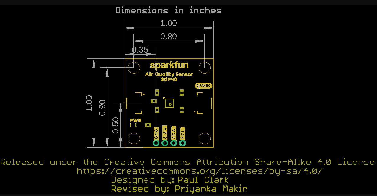 The SGP40 communicates via I2C with break-out pins to Qwiic connectors for easy connections.